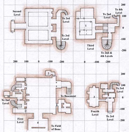 The other danger is in moving between the lower levels. To move from the basement to the catacombs requires a drop through one of two very deep holes. Once in the catacombs, the only way out is through an exit that leads you to the Field of Bone outside, back at the entrance of Kurn's Tower (inexplicably). Having levitation or lots of hit points around is useful for these drops.
