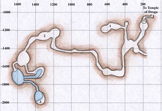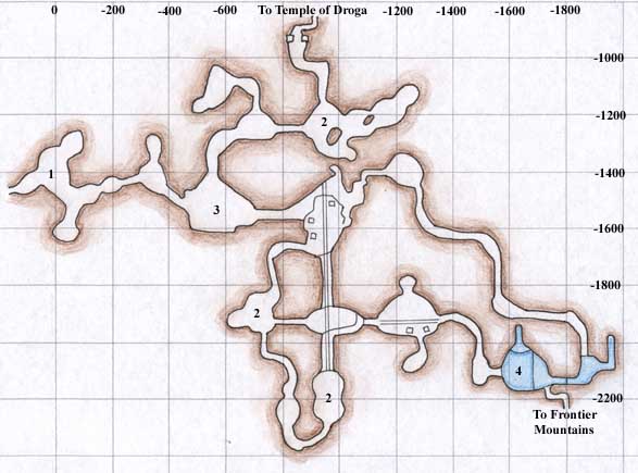 The Mines can be reached in the Frontier Mountains, at location -2955, -655. It is also possible to reach the Temple of Droga from deep within the mines. This entrance, however, is one-way, and the return entrance is quite a distance off.