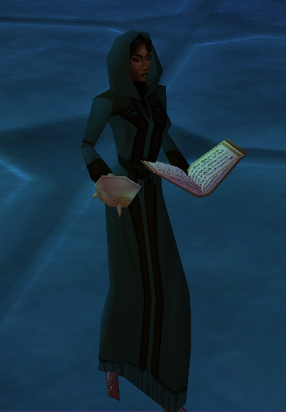 Coska Chaos, Erudite Necromancer, wearing the Rotting Robe inside Skyshrine.