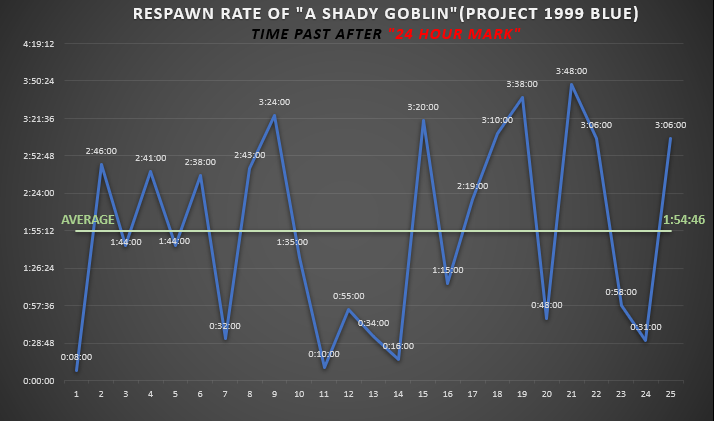 - With the current data info recolected so far, rounding up and down, the estimated guess for "a shady goblin" respawn and window would be of 25:50 hours +-1hour 50minutes.