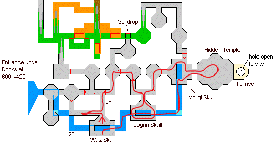The sewers here have a series of one way walls for each section. You will need to set your max FPS to around 30-35 to be able to jump out of the sewers. Your goal is to get all 3 of the skulls for your first Cudgel upgrade and to get to level 3. The An iksar outcast is level 3 with about 40hp and aggressive. He spawns at either the second or third water opening. By level 2 I started killing all the pygmy barracuda's in the water on my way back to the beginning.